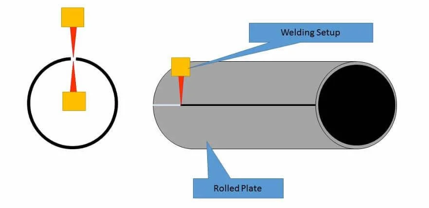 En el caso de la tubería de sierra de doble costura, las dos primeras mitades se unen mediante soldadura por puntos, lo que se denomina ajuste. La tubería de sierra de doble costura tiene dos costuras de soldadura opuestas entre sí. Ambas costuras están soldadas desde el interior y el exterior de la tubería. En el caso de tubería de alto espesor, se realiza soldadura de múltiples pasadas.